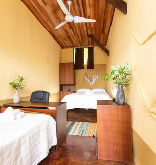 Our two Cabinas offer an intimate getaway space surrounded by jungle canopy and permaculture gardens. Their design is inspired by the region's traditional architecture, including hand-carved details and locally sourced materials.